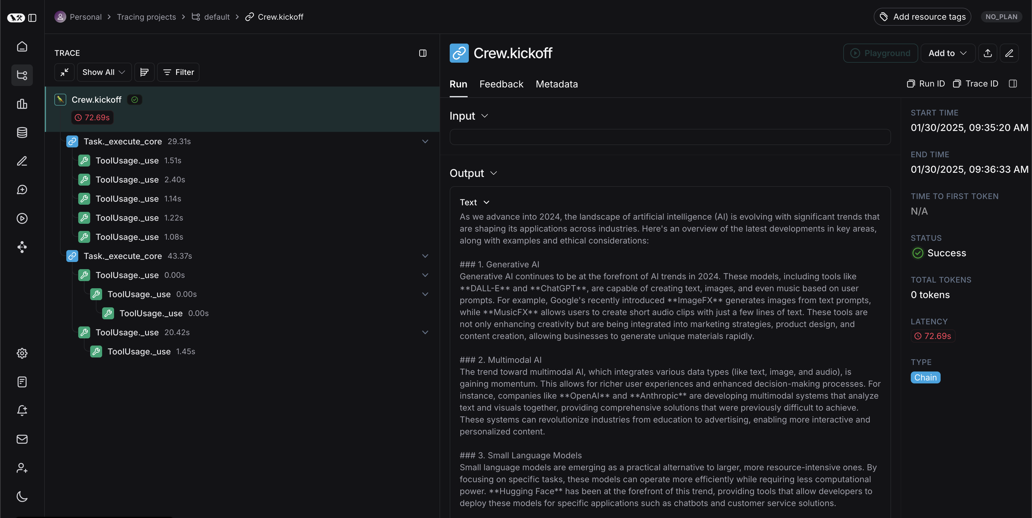 Now, you can run a CrewAI workflow and the trace will automatically be logged to LangSmith